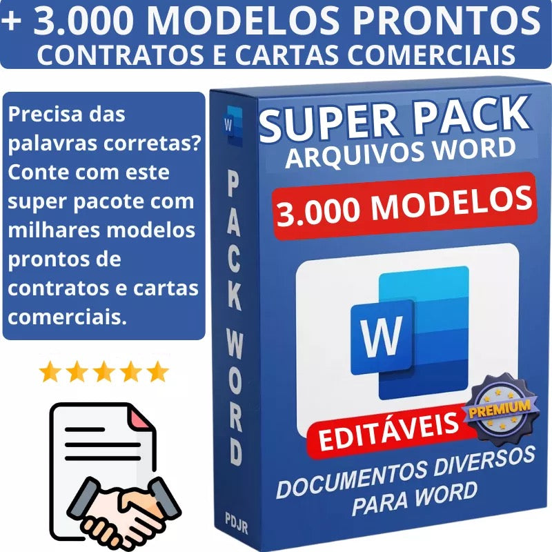 1 - Precisa de soluções rápidas e profissionais? Adquira agora nosso pacote exclusivo com mais de 300 modelos de documentos e cartas comerciais personalizáveis. São modelos prontos e versáteis, ideais para você adaptar facilmente às suas necessidades, economizando tempo e garantindo qualidade em cada comunicação. Aproveite essa oportunidade para otimizar seus processos de forma prática e eficiente!